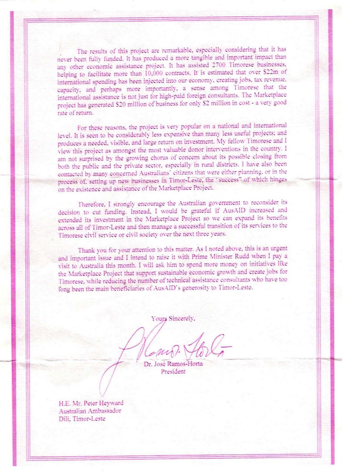 Iha karta diretu ida horisehik ba Peter Heyward, embaixadór Australia nian iha Dili, Dr Ramos Horta husu ba AusAID atu muda ninia desizaun atu ko’a nia finansiamentu ba projetu ida ne’ebé ninia operasaun hala’o husi Peace Dividend Trust (PDT) ne’ebé diriji hikas ona pelumenus osan millaun $16 ba Timor-Leste nia emprezáriu ki’ik sira.